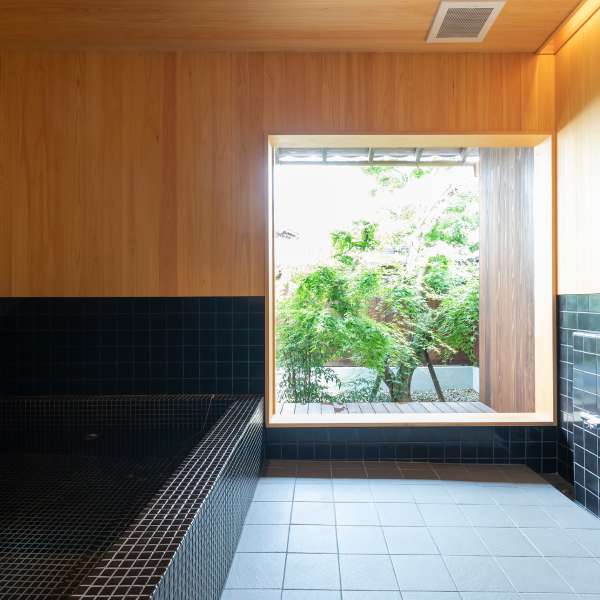 タイル張りの大きな浴槽が特徴的な大浴場では、夜はライトアップされた木々の風情をお楽しみいただけます。