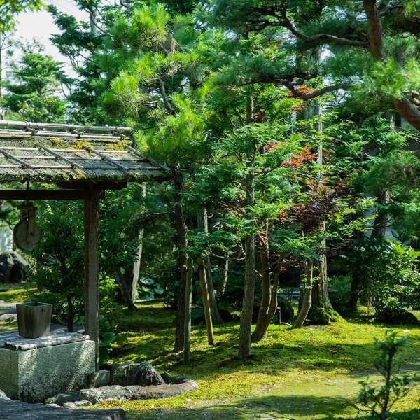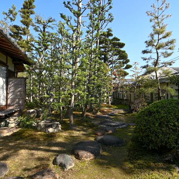 庭園はかつて「神崎郡内一番の庭」と評価され、石組や飛石などに優れた技法がのこります。松など背の高い木も組み合わされており、建物の中から見ても、お屋敷の外を通る人からも美しく見えるように設計されています。座敷からお庭をゆったり眺めながら、近江商人の暮らしに思いを馳せてみてください。