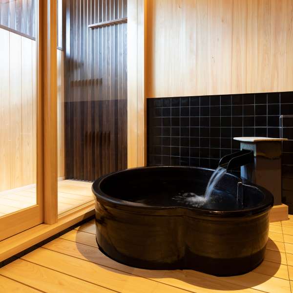 小浴場は信楽焼で作られた浴槽を設けております。お風呂に浸かれば檜の香りに癒やされます。